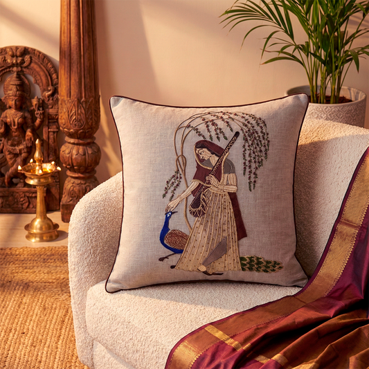 Beige Linen-Blend & Embroidered Ragamala Lady Cushion Cover